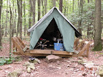 The camp is divided into two sides. The Cub Scout side (Camp DuPortail) where Day Camp is conducted is highlighted in yellow. The Boy Scout Side (Camp Meade) is on the right. Camp Meade accomodates overnight camping sites with tents. (A picture of a tent is on the left.)